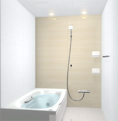 ゆったりした広さの16-16型で1坪タイプの大きさです。自動お湯はり、追い焚き、たし湯等ができるコントローラーが付いています。浴槽の排水は従来のゴム栓ではなく浴槽の縁についたポップアップボタンを押すタイプで手を濡らしません。鏡、カウンターはあえて取り付けず、収納棚もマグネット式でお掃除ラクラク仕様としました。 LIXIL/リディア
